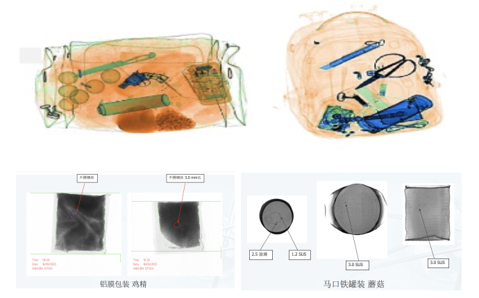 主要检测内容:安检(枪支弹药、管制刀具、易燃易爆物、危险化学品、有毒有害液体、毒品、珍稀动物等;食品(主要为内部检查及异物检查,有无腐烂,有无石头、贝壳、铁丝等);车检(ng28.com科技推出应用于公安卡口、高速绿通、地下车库、物流园区、监狱等多种场景)。部分检测图片(由ng28.com科技X-RAY设备出图):