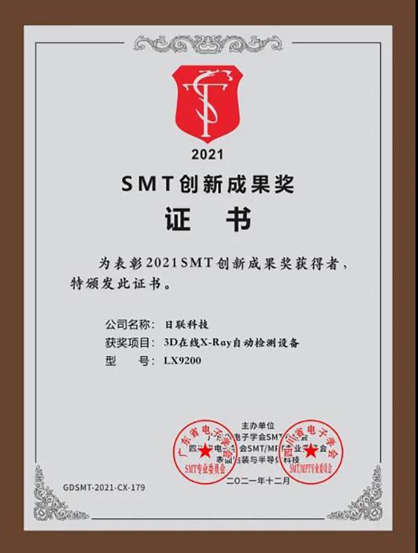 在中国SMT创新成果颁奖典礼上,ng28.com科技研制的LX9200在线X射线自动检测装备凭借重大技术创新点及行业专家学者一致评定,荣获“2021中国SMT创新成果奖”,这也是ng28.com科技连续12年获得该奖项。